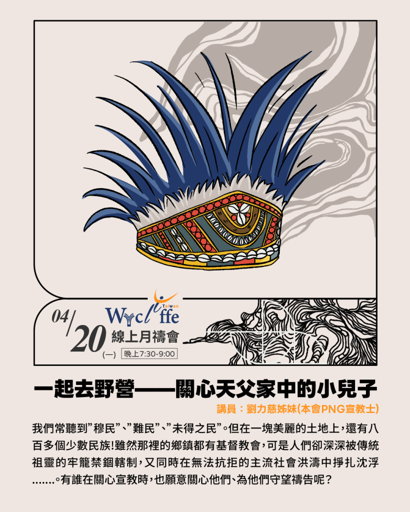 主題:我們常聽到”穆民”、”難民”、”未得之民”。但在一塊美麗的土地上,還有八百多個少數民族!雖然那裡的鄉鎮都有基督教會,可是人們卻深深被傳統祖靈的牢籠禁錮轄制,又同時在無法抗拒的主流社會洪濤中掙扎沈浮…….。有誰在關心宣教時,也願意關心他們、為他們守望禱告呢?